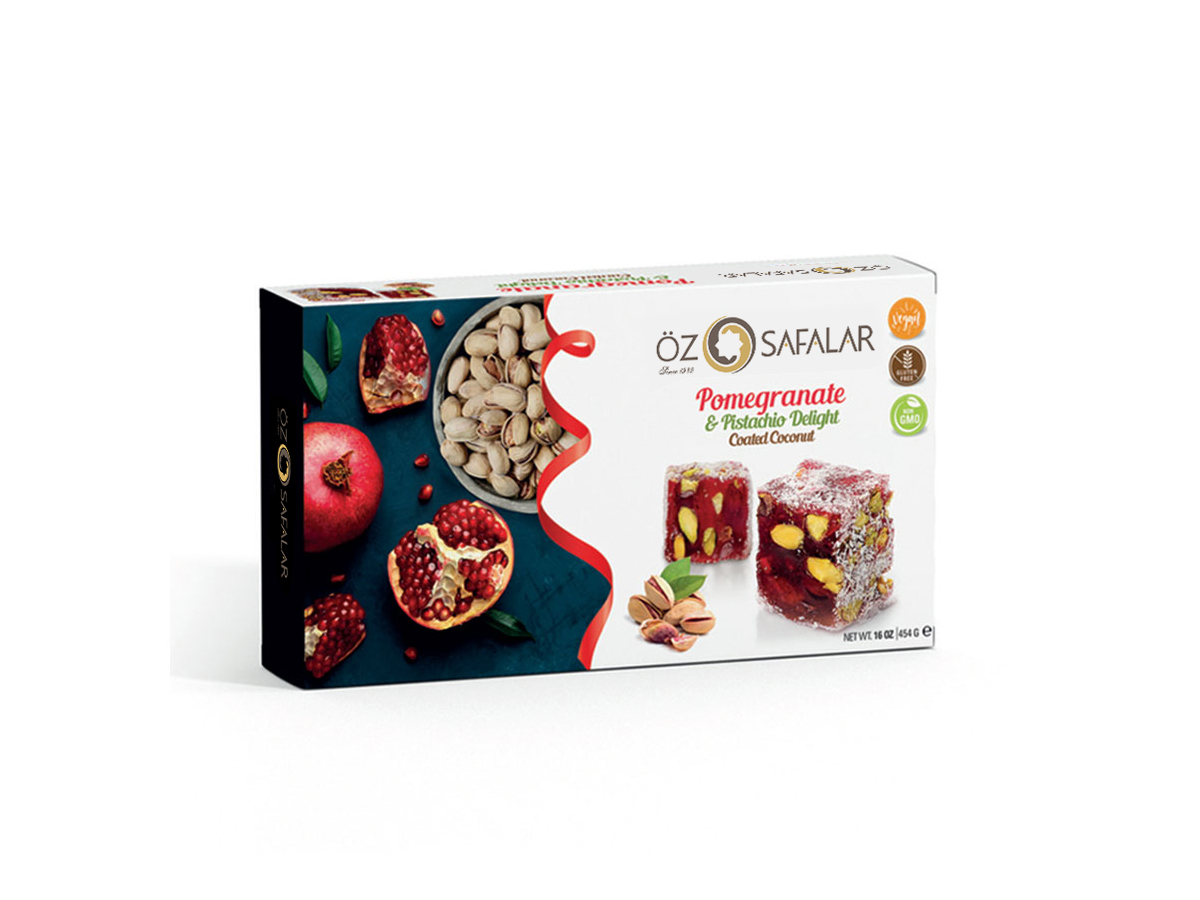 Pomegranate Flavored Pistachio Turkish Delight combines the refreshing sweet-and-tart aroma of pomegranate with the rich flavor of pistachios. Each bite reveals the freshness of pomegranate and the intense aroma of pistachio. With its vibrant color and balanced taste, this delight stands out as part of the Special Packaged Turkish Delight category and is a perfect choice for guest offerings and gift presentations.