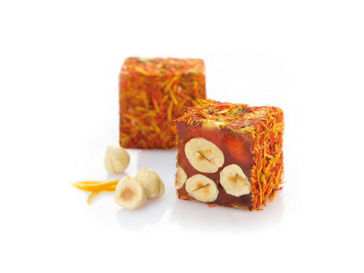Orange Flavored Hazelnut Turkish Delight with Safflower Petal Coating
