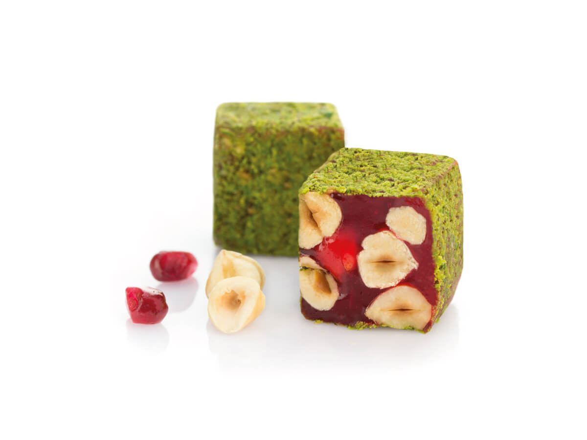 Pomegranate Flavored Hazelnut Turkish Delight with Ground Pistachio Coating