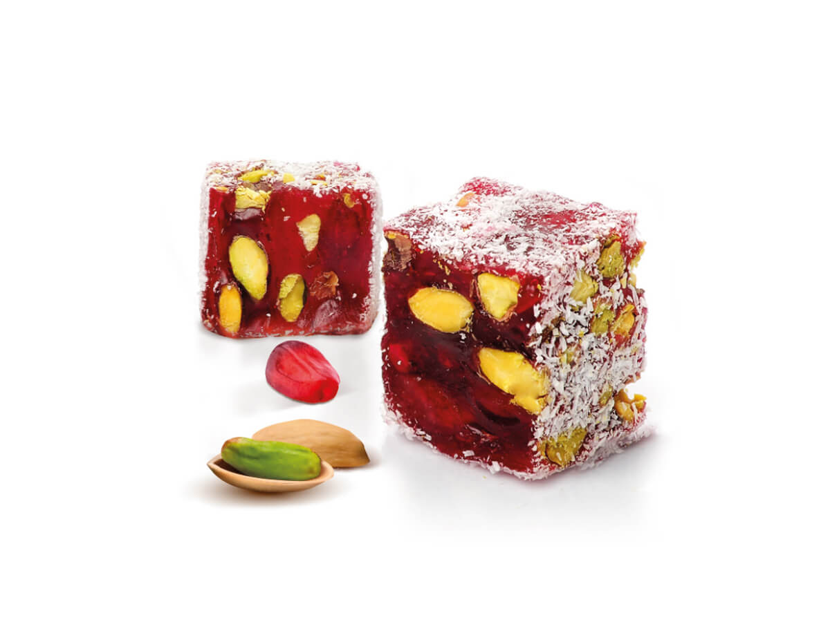 Pomegranate Flavored Pistachio Turkish Delight with Coconut Coating