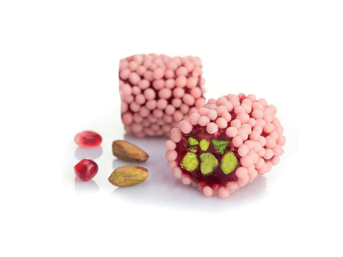 A. Pistachio & Pomegranate Flavored Ribbon Turkish Delight Coated with Pink Chocolate